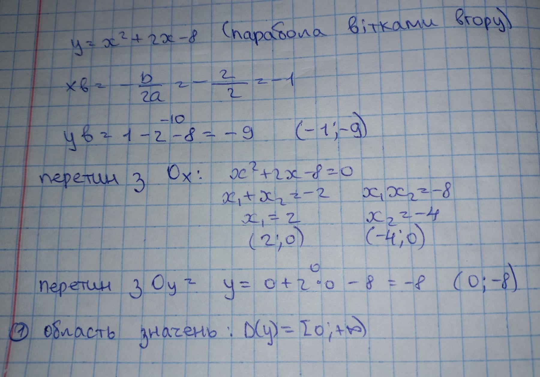 Побудуйте графік функції у = х²+2х-8. За графіком знайдіть: