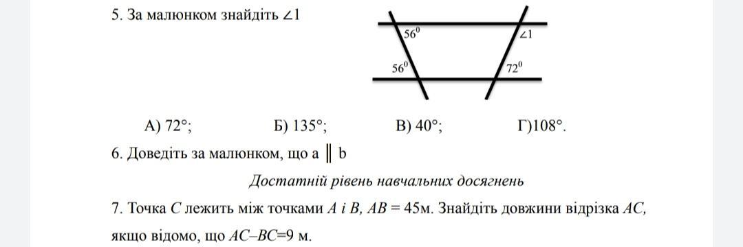 Объяснение: 5. Сначала выясняем смежный угол с углом 72°: 180° - 72° = 108°. Внутренние накрест лежащие углы равны, поэтому ∠1 = 108°.
