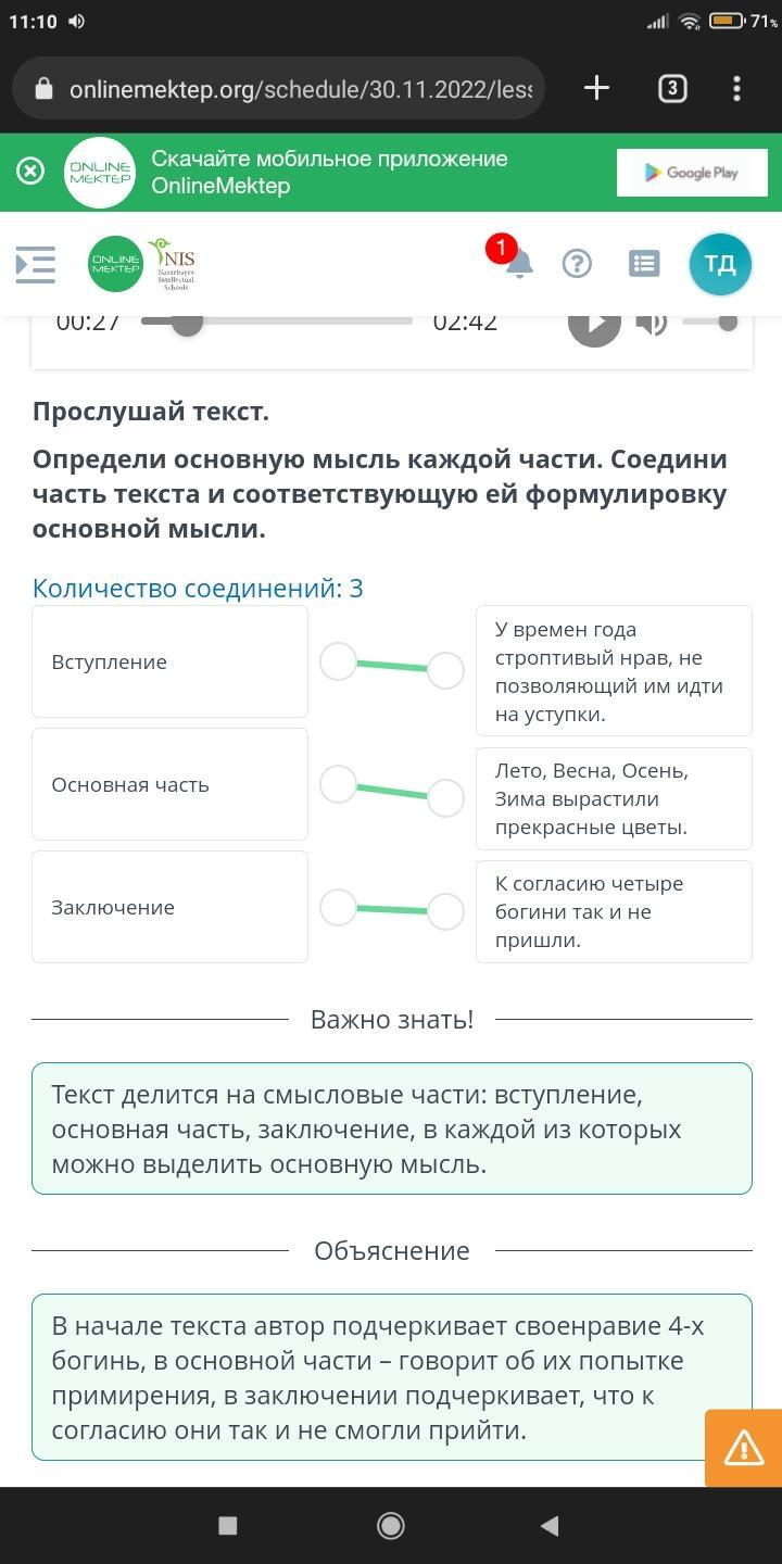 Признаки времен года 00:00 02:42 Прослушай текст. Определи основную мысль каждой части. Соедини часть текста и соответствующую ей формулировку основной мысли. Количество соединений: 3 Вступление Основная часть Заключение У времен года строптивый нрав, не позволяющий им идти на уступки. Лето, Весна, Осень, Зима вырастили прекрасные цветы. К согласию четыре богини так и не пришли. Назад Проверить