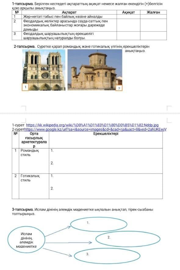 1-тапсырма. Берілген кестедегi ақпараттың ақиқат немесе жалған екендiгiн (+)белгiсiн кою арқылы анықтаңыз. Nº Ақиқат Жалған Ақпарат 1 Жер-негiзгi табыс пен байлык көзiне айналды 2 3 Феодалдық иеліктер арасында сауда-саттық пен экономикалық байланыстар жоғары дәрежеде дамыды Феодалдық шаруашылықтың ерекшелiгi шаруашылыктын натуралды болуы. 2-тапсырма. Суретке қарап романдық және готикалық үлгiнiң ерекшеліктерін анықтаңыз.Орта ғасырлық архетектурала Р 1 Романдык стиль 2 Готикалық стиль 1. Ислам дiнiнiң әлемдiк мәдениетке 2. 1. 2. 3-тапсырма. Ислам дiнiнiң әлемдік мәдениетке ықпалын анықтап, тірек-сызбаны толтырыныз. 1. Ерекшелiктерi 3. 2.