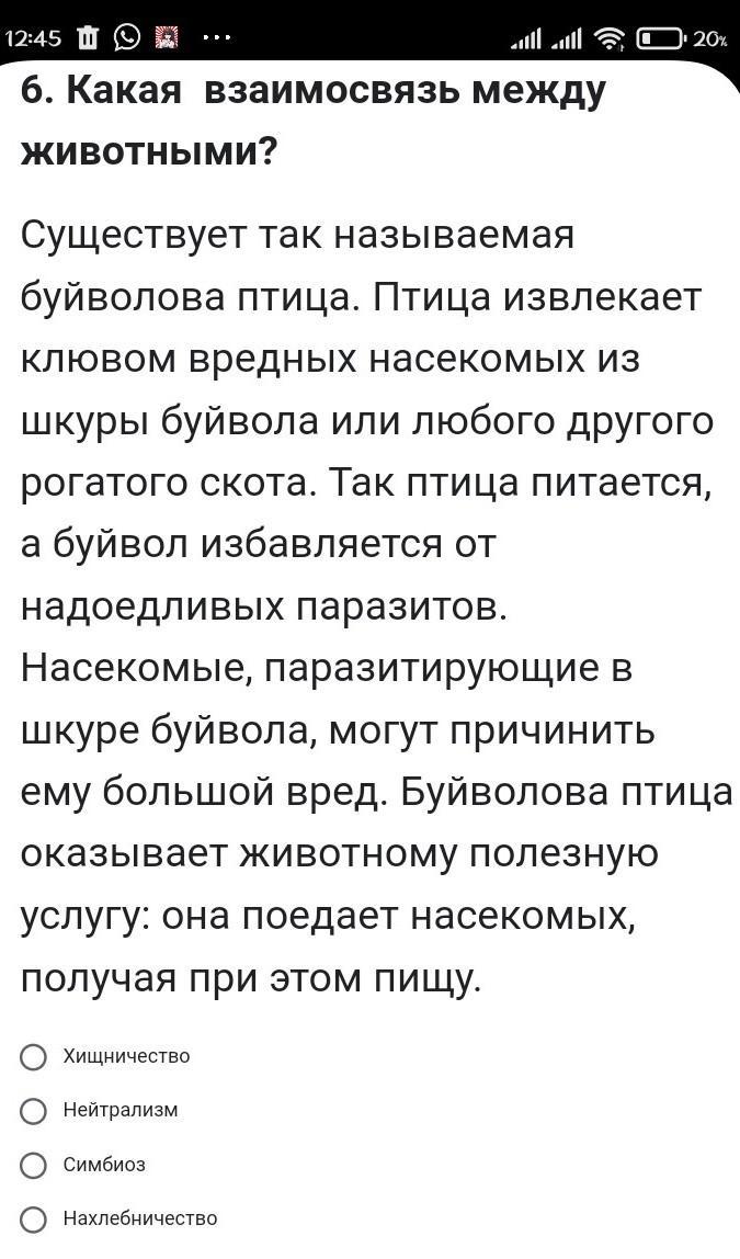 Существует так называемая буйволова птица. Птица извлекает клювом вредных насекомых из шкуры буйвола или любого другого рогатого скота. Так птица питается, а буйвол избавляется от надоедливых паразитов. Насекомые, паразитирующие в шкуре буйвола, могут причинить ему большой вред. Буйволова птица оказывает животному полезную услугу: она поедает насекомых, получая при этом пищу