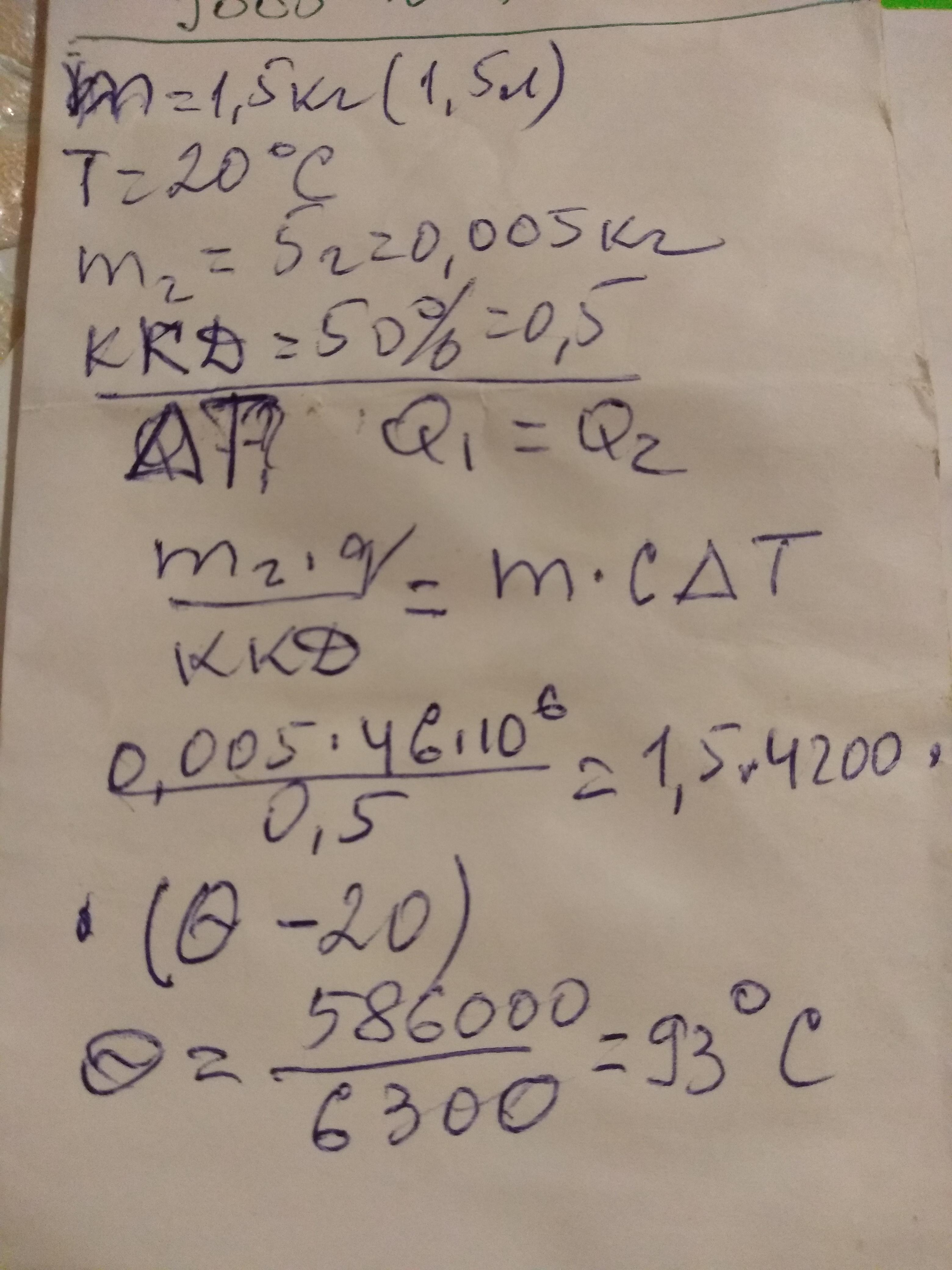 До якої температури можна нагріти 1,5 л води, взятої при температурі 20ºС, якщо спалити 5 г гасу. Вважайте, що на нагрівання води пішло лише половина енергії, яка виділилась при спалюванні гасу
