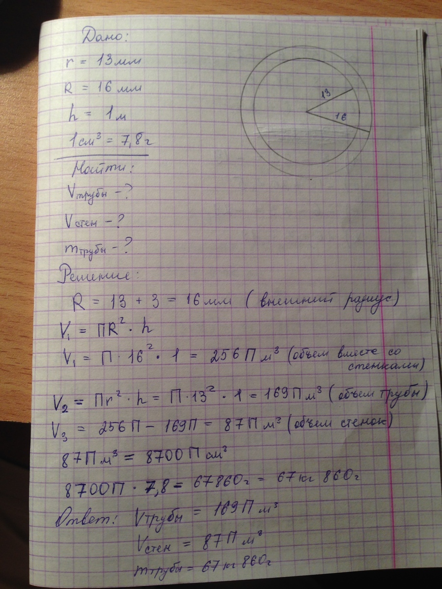Внутренний радиус трубы равен 13 мм,а толщина стенки 3 мм.Найдите объём трубы длинной 1 м, объём стенок трубы и массу трубы, если 1 см³ материала стенки весит 7,8 г. Выразите в процентах отношение площадей внутренней и внешней поверхностей трубы.