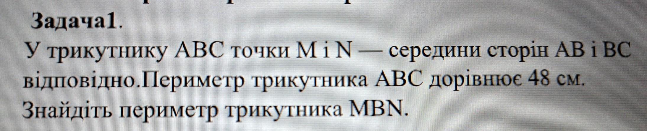 у треугольника 3 стороны, каждая сторона треугольника который надо найти это половина стороны треугольника ABC, значит делим 48 на 6 = 8. 8 это сторона треугольника MBN, значит осталось умножить на 3, т к у треугольника 3 стороны. 8 * 3 = 24. Остается только помолиться чтобы треугольник ABC был равносторонний...