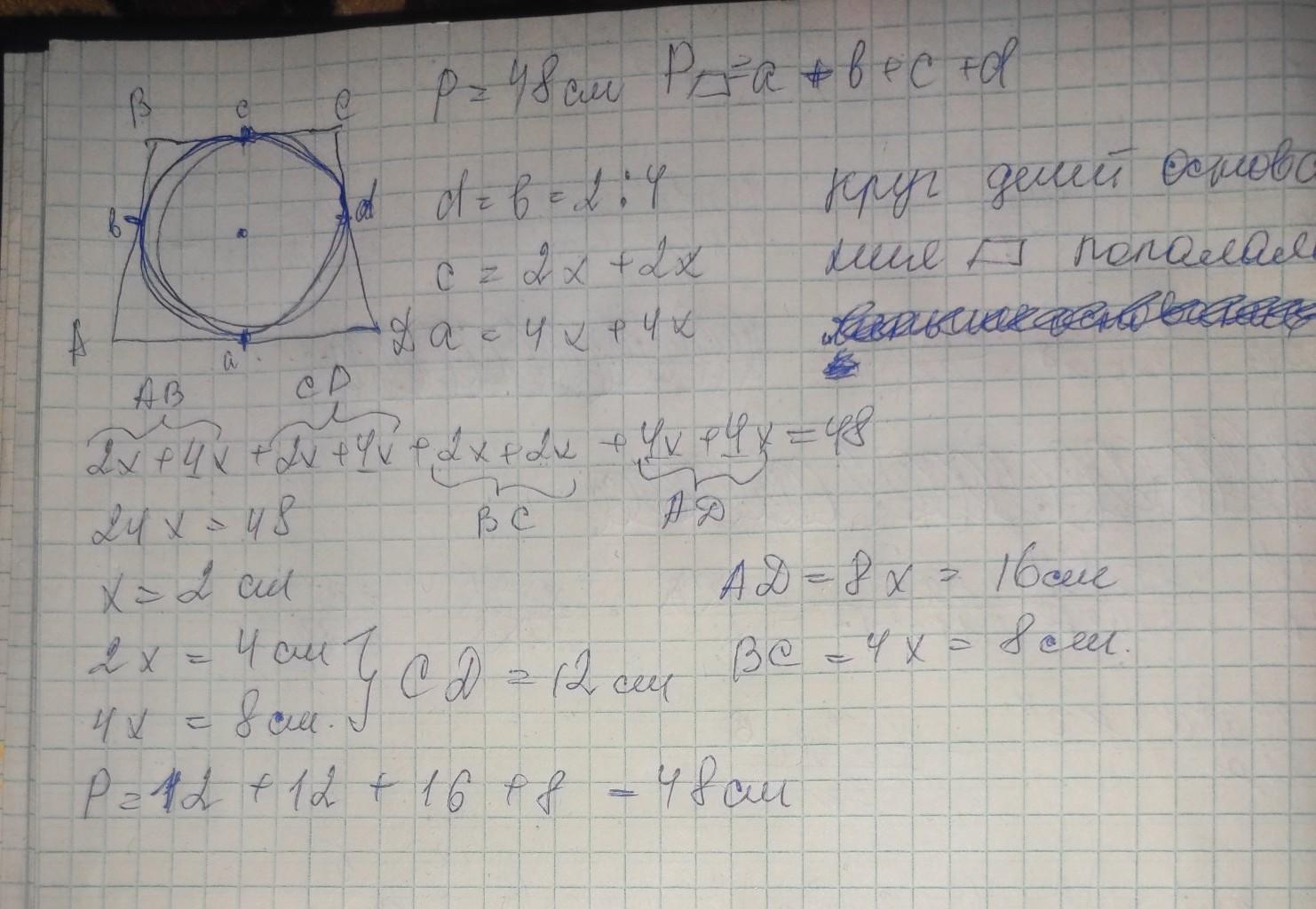1. Периметр рівнобічної трапеції АВСD дорное 48см.Коло, вписане в трапецiю, ділить бічну сторону CD на вiдрiзкя, довжини яких вiдносяться як 2:4. Знайти довжини цих вiдрiзкiв.