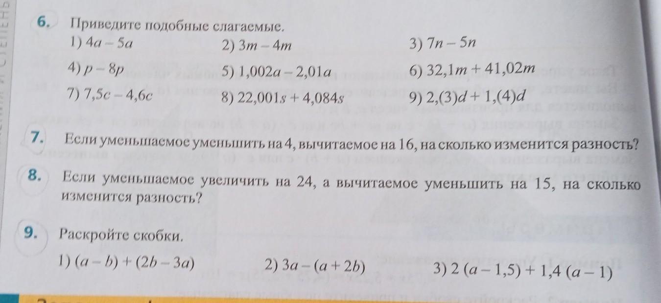 6. Приведите подобные слагаемые. 1) 4a-5a 2) 3m-4м 4) p - 8p 7)7,5c 4,6c 5) 1,002a-2,01 8) 22,001s +4,084s 9. Раскройте скобки. 1) (a - b) + (2b-3a) 7. Если уменьшаемое уменьшить на 4, вычитаемое на 16, на сколько изменится разность? Если уменьшаемое увеличить на 24, а вычитаемое уменьшить на 15, на сколько изменится разность? 8. 3) 7n - 5n 6) 32,1m + 41,02m 9) 2,(3)d + 1,(4)d 2) 3а-(a+2b) 3) 2 (a - 1,5) + 1,4 (a - 1)