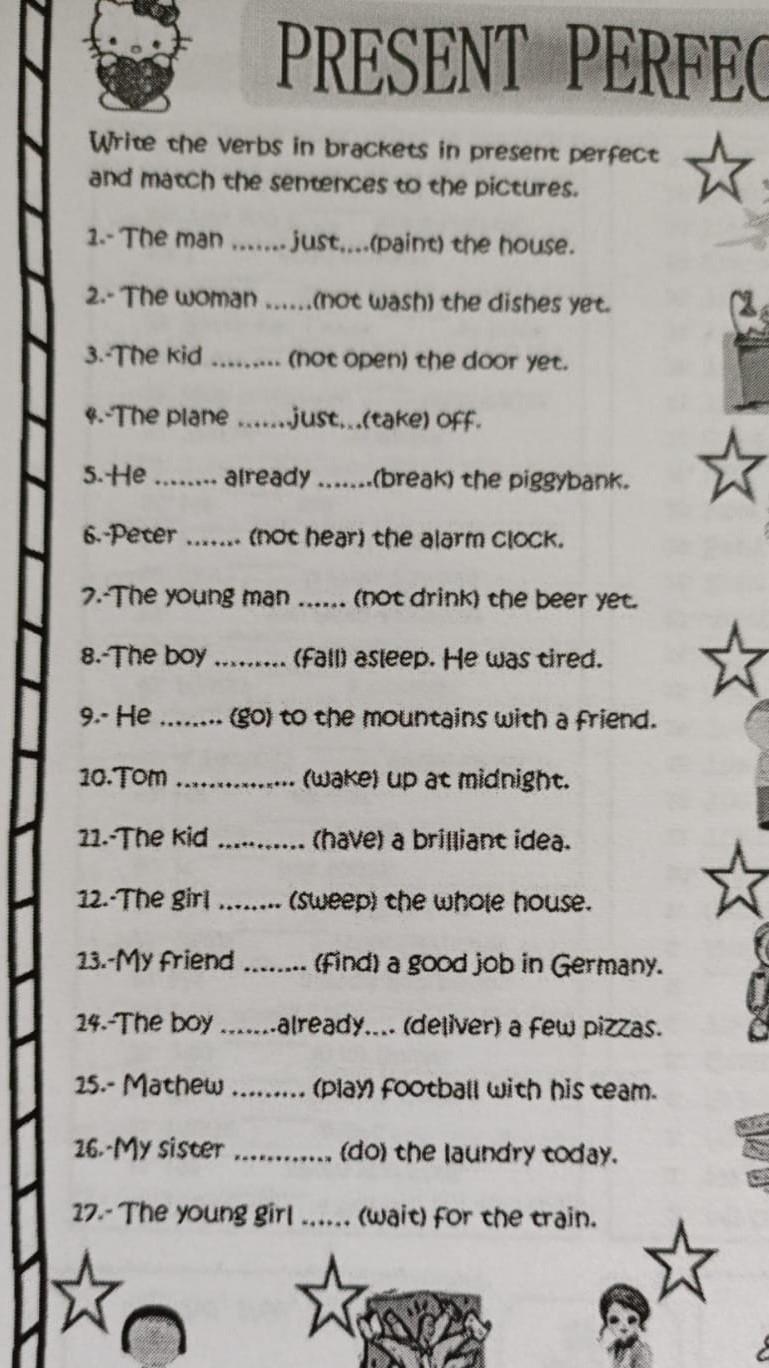 Write the verbs in brackets in present perfect and match the sentences to the pictures. 1.- The man ....... just....(paint) the house. 2.- The woman ......(not wash) the dishes yet. (not open) the door yet. 3.-The kid 4.-The plane....just...(take) off. 5. He already .......(break) the piggybank. 6.-Peter ....... (not hear) the alarm clOCK. 7.-The young man ...... (not drink) the beer yet. 8.-The boy. ......... (Fall) asleep. He was tired. 9.- He (go) to the mountains with a friend. 10. Tom ............... (wake) up at midnight. 11.-The kid ........... (have) a brilliant idea. 12. The girl . (sweep) the whole house. 13.-My friend........ (find) a good job in Germany. 14.-The boy.....already.... (deliver) a few pizzas. 25.- Mathew......... (play) football with his team. 16.-My sister ............ (do) the laundry today. 17.-The young girl...... (wait) for the train.