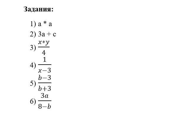 1) a*a 2) За + с х*у 3) 4) 5) 6) 4 1 x-3 b-3 b+3 За 8-b
