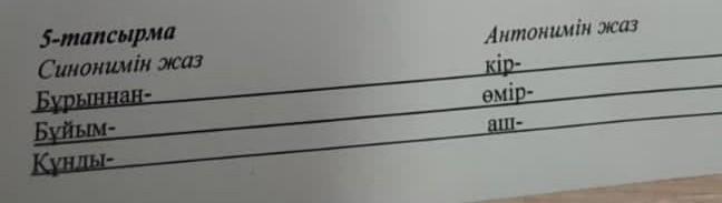 5-тапсырма Синонимін жаз Бурыннан- Буйым- Кунды- Антонимін жаз кір- өмір- аш-
