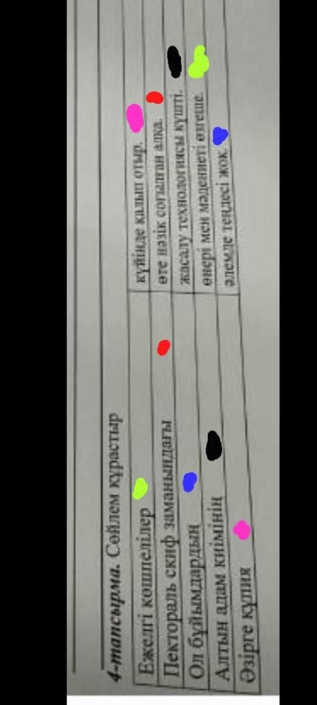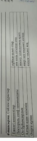 4-тапсырма. Сойлем курастыр Ежелгi кошпелілер Пектораль скиф заманындагы Ол буйымдардын Алтын адам кнiмiнiн Әзiрге купия куйiнде калып отыр. ете назик согалган алка. жасалу технологиясы кушт енерi мен мәдениеті озгеше. алемде тендест жок.
