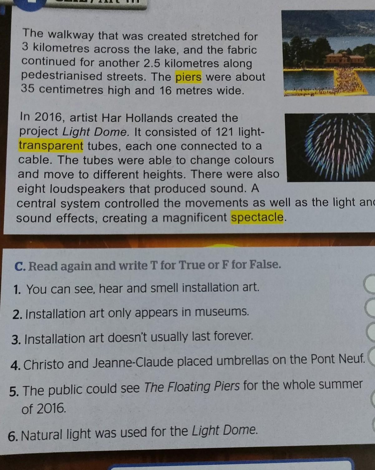 C. Read again and write T for True or F for False. 1. You can see, hear and smell installation art. 2. Installation art only appears in museums. 3. Installation art doesn't usually last forever. 4. Christo and Jeanne-Claude placed umbrellas on the Pont Neuf. 5. The public could see The Floating Piers for the whole summer of 2016. 8 6. Natural light was used for the Light Dome.