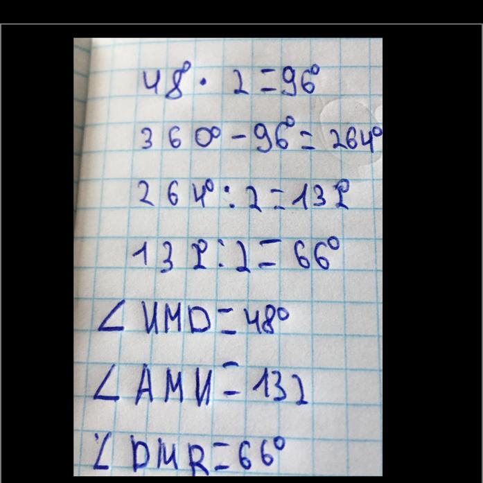 прямі AD і BN перетинаються в точці M, кута AMB = 48°, MR бісектриса кута BMD. Знайдіть кут NMD, кут AMN, кут BMR