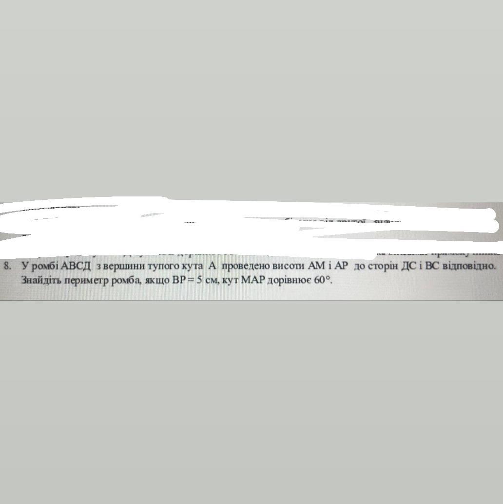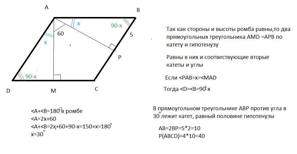 в ромбе АВСD с вершины тупого угла А проведены высоты АМ и АP к сторонам ДС и ВС соответственно.Найдите периметр ромба, если ВP=см, угол МАР равен 60 грдусов.
