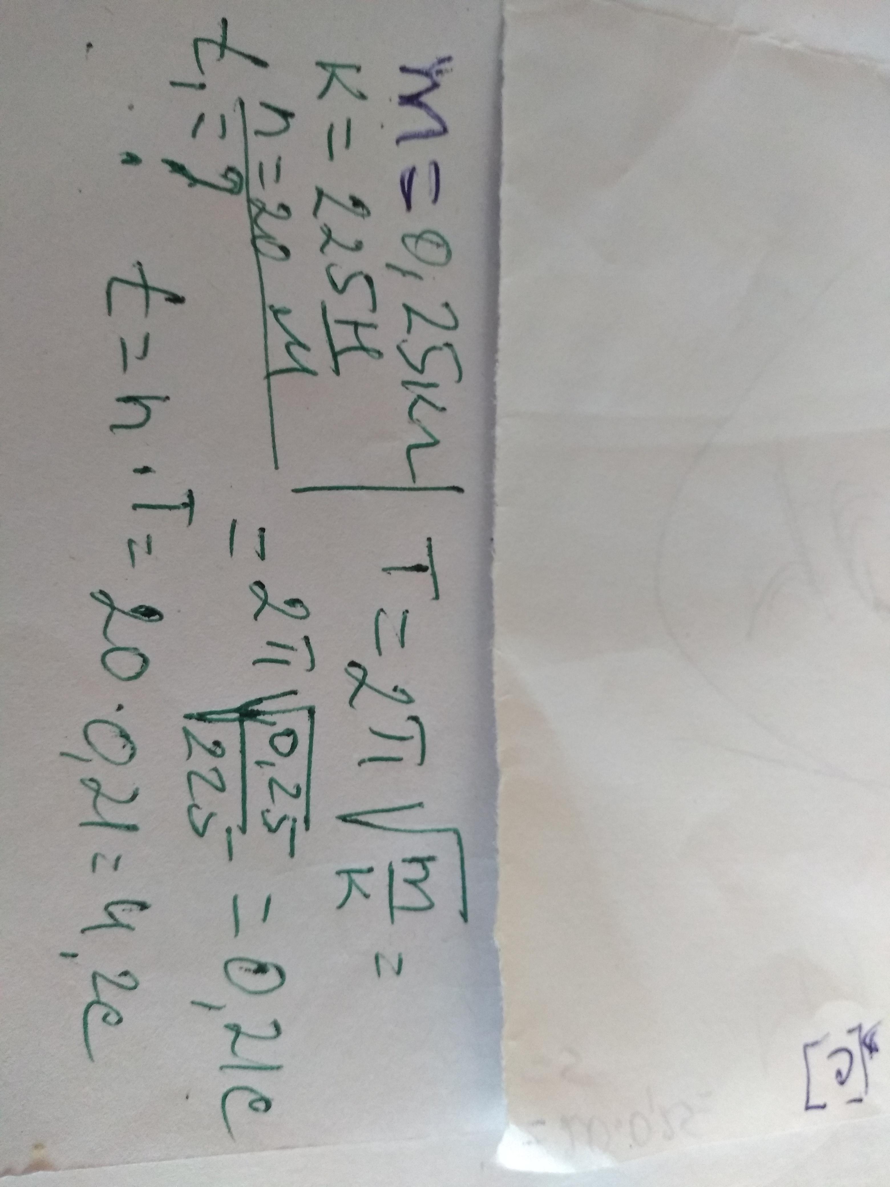 Груз массой 0,25 кг колеблется на пружине с жесткостью 255 Н/м чему равен его период колебаний? За какое время он совершает 20 колебаний?