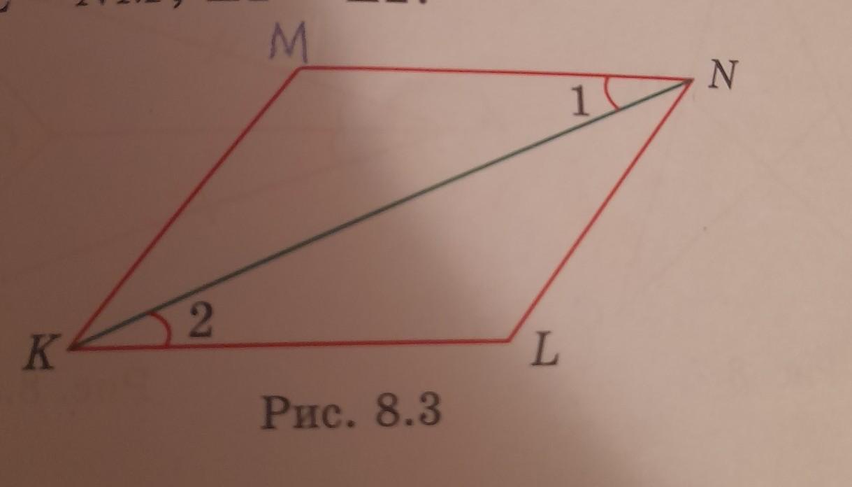 8.3. На рисунке 8.3 KL = NM = 4 см, угол 1 равен углу 2 = KM = 3 см. Найдите LN. Тольники АВН и СВН, изображенные на рисунке