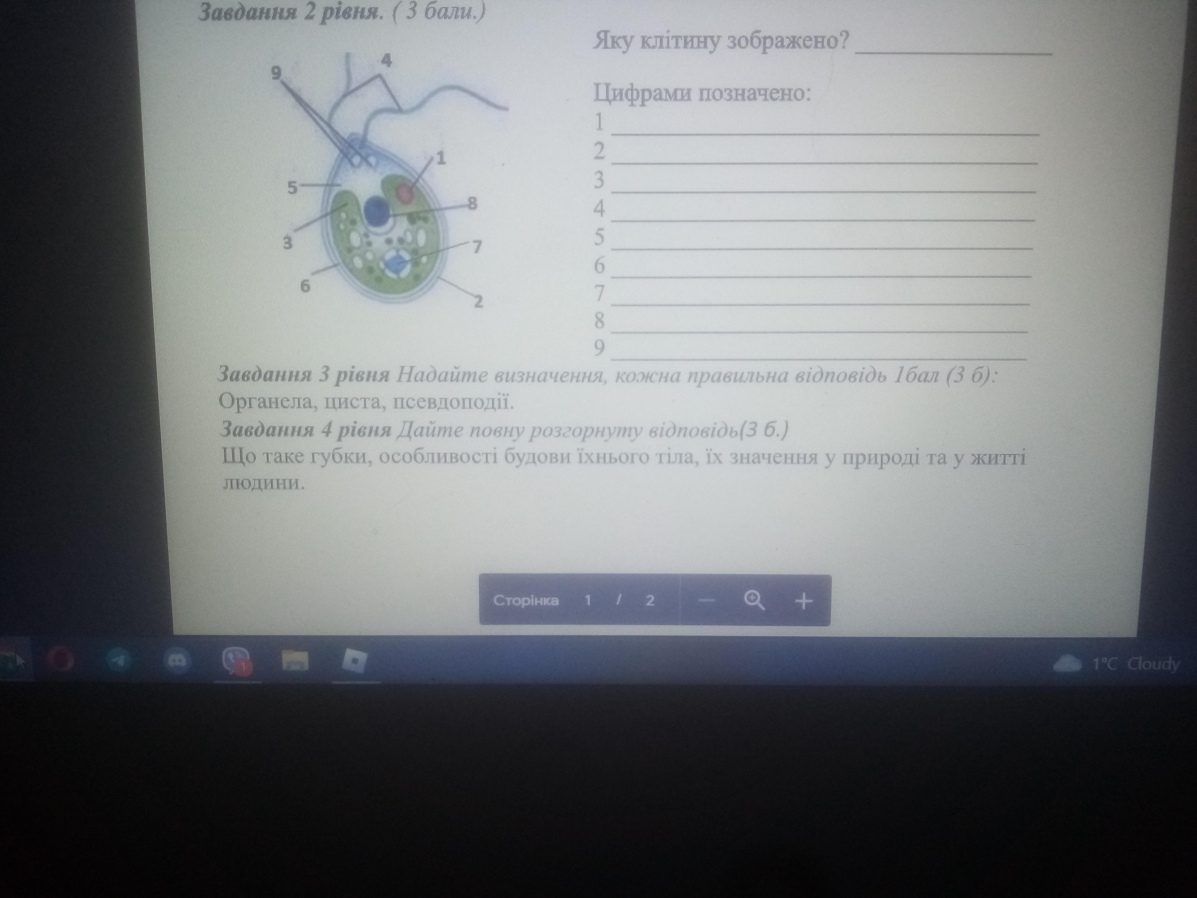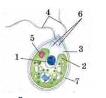 1 - ядро; 2 - хлоропласт; 3 - цитоплазма; 4 - два джгутики; 5 - червоне вічко; 6 - дві скоротливі вакуолі; 7 - клітинна оболонка. Завдання. Розгляньте малюнок і знайдіть складові будови хламідомонади