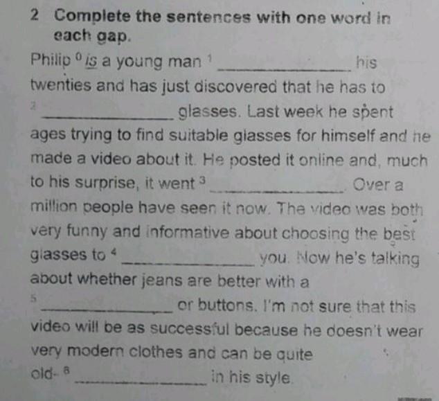 Philip is a young man ¹ his twenties and has just discovered that he has to glasses. Last week he spent ages trying to find suitable glasses for himself and he made a video about it. He posted it online and, much to his surprise, it went 3 Over a million people have seen it now. The video was both very funny and informative about choosing the best glasses to 4 you. Now he's talking about whether jeans are better with a 5 or buttons. I'm not sure that this video will be as successful because he doesn't wear very modern clothes and can be quite old- a in his style.