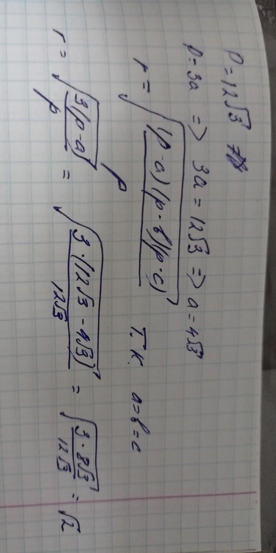 6. Периметр правильного трикутника 12√3 см. Чому дорівнює радіус кола, вписаного у трикутник? А) 4√3 см; Б) 2 см; В) 4 см; Г) 12 см.