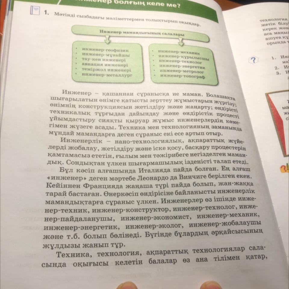 Меннім мәтінен түйген ойым инжнерлік қашанда керек әрдайым тапыладын мамандық жалпы айтсақ өлмейдін. Сонымен қоса инженерлік мамандықтың шығу тегінің өзі ерекше. Әрине қазірдің өзіне жетіп тұрған инженерлік мамандықтың неше түрлері шықты жалпырақ қортындалағанда инженерлік қазіргі замаға керек мамандық десекте болады себебі заман дамыған бұрынғыдай болмайтын сабақ емес инфомат,физомат,айтис, инженердің заманы десекте болады!!!