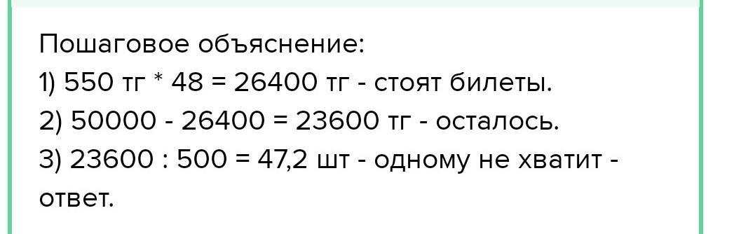 5 МАТЕМАТИКА КҮНДЕЛІКТІ ӨМІРДЕ Есепті шығар. Музейге 550 теңгеден 48 балалар билеті сатып алынды. Есеп- тесу үшін ішінде 50 000 теңгесі бар банк картасы ұсыныл- ды. Содан соң әр балаға 500 теңгеден кәдесый сатып алу керек болды. Карточкада қалған ақша кәдесыйлар сатып алуға жете ме?