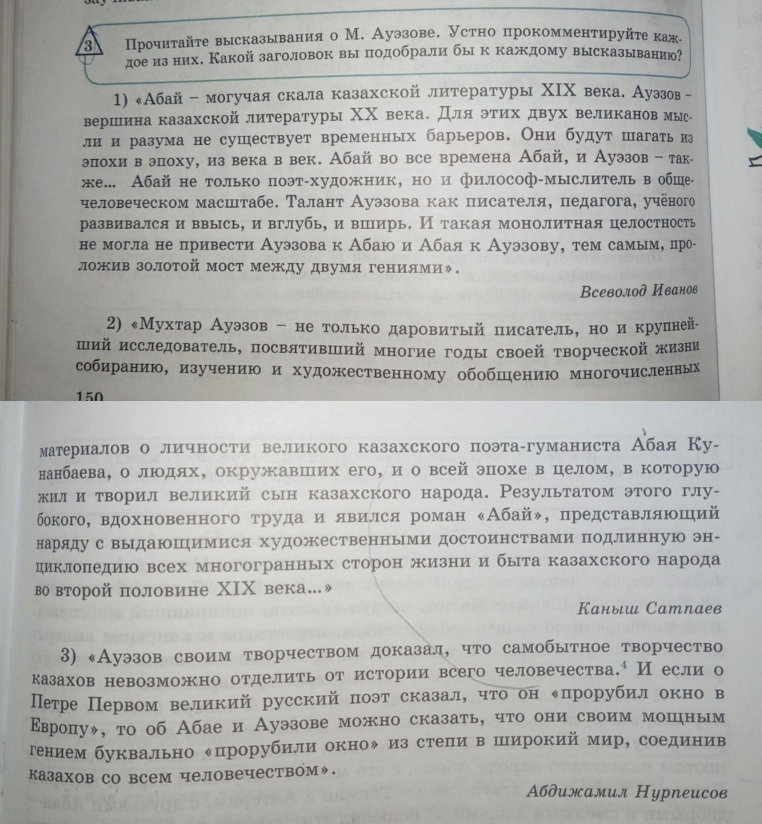 3.Прочитайте высказывания о М. Ауэзова. Устно прокомментируйте каждое из них. Какой заголовок вы подобрали бы к каждому высказывания?