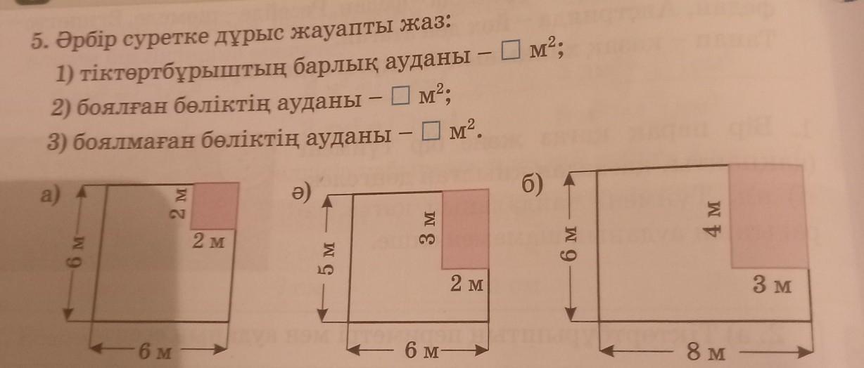 5. Әрбір суретке дурыс жауапты жаз: 1) тіктөртбұрыштын барлық ауданы - м²; 2) боялған болiктiн ауданы - м²; 3) боялмаған белiктiн ауданы - О м². a) 6 M 6 м 2 м NZ 2 м 4-WG 5 м- WE 3 м 6 м 2 м 6) 4 6 м 4 м 8 м 3 м