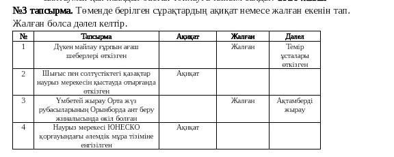 3 тапсырма. Төменде берілген сұрақтардың акикат немесе жалған екенін тап. Жалған болса дәлел келтір. Nº Тапсырма 1 Дүкен майлау ғұрпын ағаш шеберлері өткізген 2 3 Шығыс пен солтустiктегi казактар наурыз мерекесін қыстауда отырғанда өткізген Умбетей жырау Орта жүз рубасыларының Орынборда ант беру жиналысында екiл болган Ақиқат Жалған Дәлел