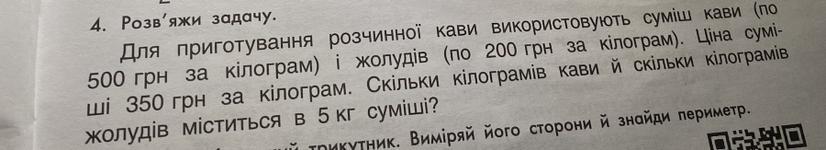 500 грн за кілограм) і жолудів (по 200 грн за кілограм). Ціна сумі-ші 350 грн за кілограм. Скільки кілограмів кави й скільки кілограмів жолудів міститься в 5 кг суміші?