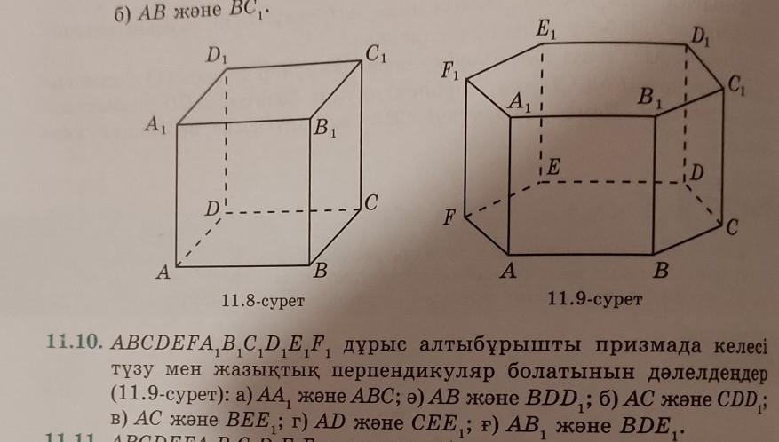 11.10. ABCDEFA,B,C,D,E,F, дұрыс алтыбұрышты призмада келесі түзу мен жазықтық перпендикуляр болатынын дәлелдеңдер (11.9-сурет): а) АА, және ABC; ә) АВ және BDD; б) АС және CDD,; в) АС және ВЕЕ;; г) AD және CEE; ғ) AB, және BDE.. 11.11. АВCDEFA BCDEF