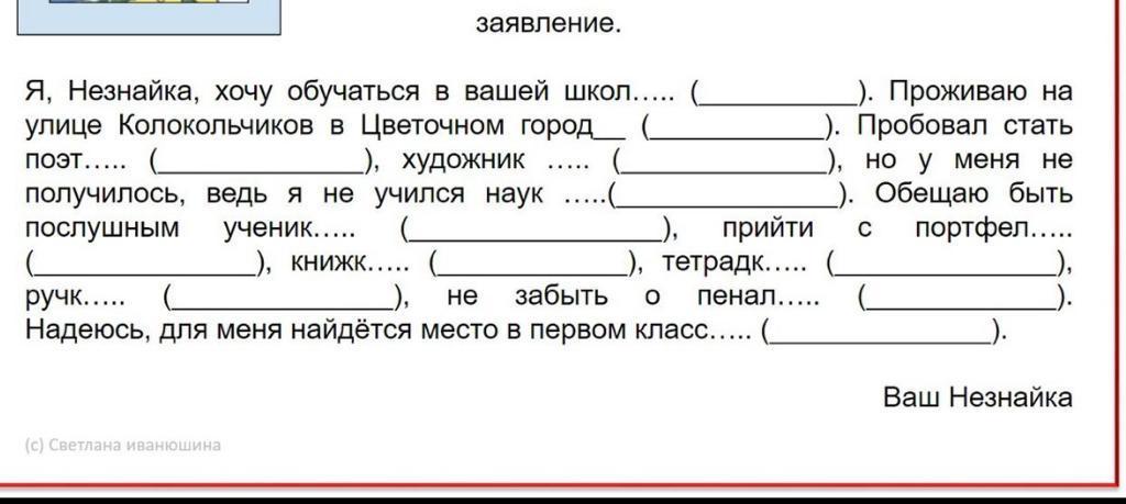 Я не знайка хочу обучаться в вашей школе (Д п, 2 скл). Проживаю на улице Колокольчиков в Цветочном городе (П п, 2 скл). Пробовал стать поэтом (Т п, 2 скл), художником (Т п, 2 скл), но у меня не получилось, я ведь не учился науке (Д п, 2 скл). Я обещаю быть послушным учеником (Т п, 2 скл). прийти с портфелем(Т п, 2 скл), книжкой (Т п, 2 скл), тетрадкой (Т п, 2 скл), ручкой (Т п, 2 скл), не забыть о пенале (П п, 2 скл). Надеюсь, для меня найдется место в первом классе (П п, 2 скл).