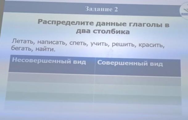 Распределите данные глаголы в два столбика Летать, написать, спеть, учить, решить, красить, бегать, найти. Несовершенный вид Совершенный вид