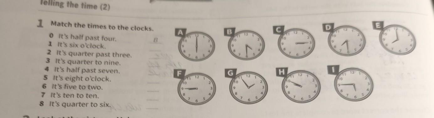 VOCABULARY AND READING Telling the time (2) 1 Match the times to the clocks. 0 It's half past four. 1 It's six o'clock. 2 It's quarter past three. 3 It's quarter to nine. 4 It's half past seven. 5 It's eight o'clock. 6 It's five to two. 7 It's ten to ten. 8 It's quarter to six. B Ka A 10 9 F 8 11 10 9 8 7 11 7 6 12 6 1 5 NMA 1 5 2 4 2 3 4 B 10 9 10 G 11 7 10 9 8 12 7 6 12 1 6 5 2 m 4 1 5 -WN 3 4 C 11 10 9 8 H N 7 10 9 11 12 8 C 6 1 5 12 6 N 3 4, 5 3 4 D 11 10 9 8 7 12 1 11 10 9 8 7 5 12 2 6 3 4 1 2 5 3 E 11 10 9 8 ~