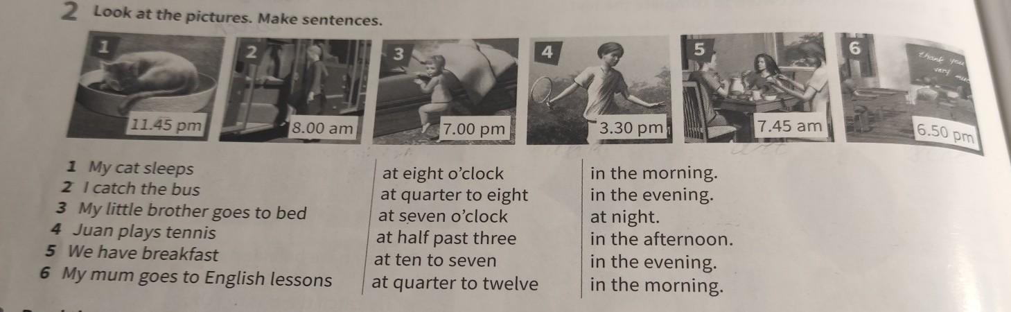 2 Look at the pictures. Make sentences. 1 11.45 pm 1 My cat sleeps 2 I catch the bus 2 8.00 am 3 My little brother goes to bed 4 Juan plays tennis 5 We have breakfast 6 My mum goes to English lessons 3 7.00 pm 4 at eight o'clock at quarter to eight at seven o'clock at half past three at ten to seven at quarter to twelve 3.30 pm 5 in the morning. in the evening. at night. in the afternoon. in the evening. in the morning. 7.45 am very min 6.50 pm