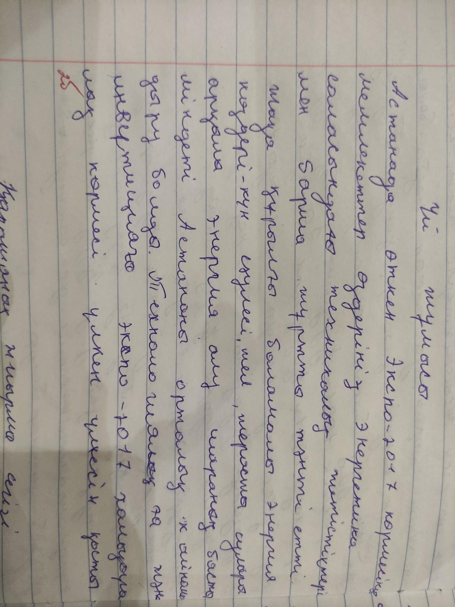 Үй тапсырмасы: «ЕХРО көрмесінің Қазақстан үшін маңызы қандай болды?» деген тақырыпта 120-150 сөзден тұратын эссе жазу. Дескриптор: Эссе тақырыбының желісінен шықпайды-2 балл; Сыни тұрғыдан ойлап, сауатты, жүйелі жазады-5 балл. Құрылымын сақтайды-3 балл * КІРІСПЕ (30-40 сөз) * НЕГІЗГІ БӨЛІМ (60-70 сөз) * ҚОРЫТЫНДЫ (30-40 сөз)