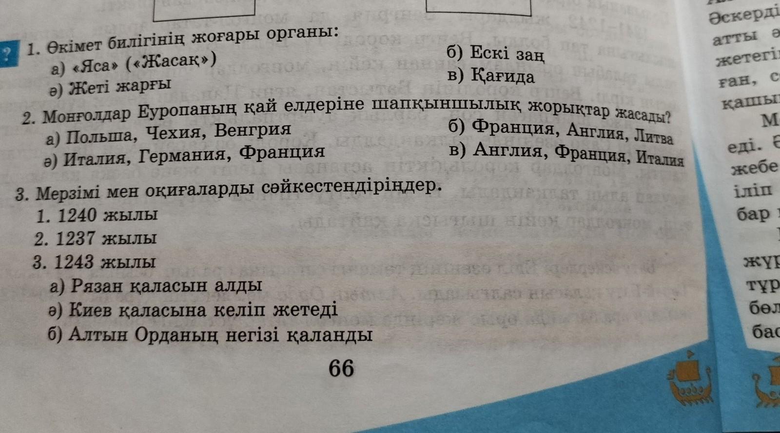 1. Өкімет билігінің жоғары органы: а) «Яса» («Жасақ») ә) Жеті жарғы " 2. Монғолдар Еуропаның қай елдеріне шапқыншылық жорықтар жасады? а) Польша, Чехия, Венгрия б) Франция, Англия, Литва ә) Италия, Германия, Франция в) Англия, Франция, Италия BHATOS 3. Мерзiмi мен оқиғаларды сәйкестендіріңдер. 1. 1240 жылы 2. 1237 жылы 3. 1243 жылы а) Рязан каласын алды ә) Киев қаласына келіп жетеді б) Алтын Орданың негізі қаланды 17 б) Ескі заң в) Қағида Әс а E