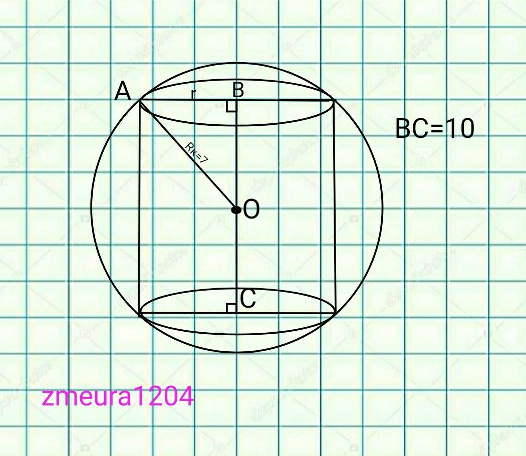 Срочно 50 балов !!!! У кулю вписано циліндр. Знайдіть відношення об’єму кулі до об’єму циліндра. (позначення Rк – радіус кулі, H– висота циліндра). Rк= 7 см, Н=10 см.