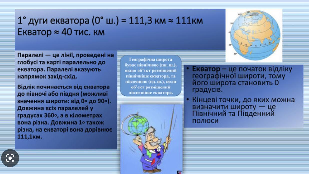 Паралельно екватору проведено лінії, які називають паралелями. Вони мають значення від 0° до 90°. Знайти на глобусі паралелі