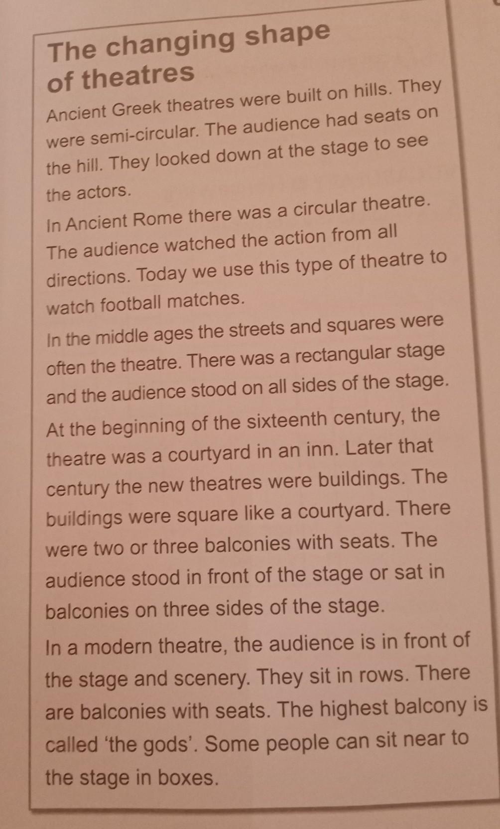 1 The seats in an Ancient Greek theatre were above the stage._______________