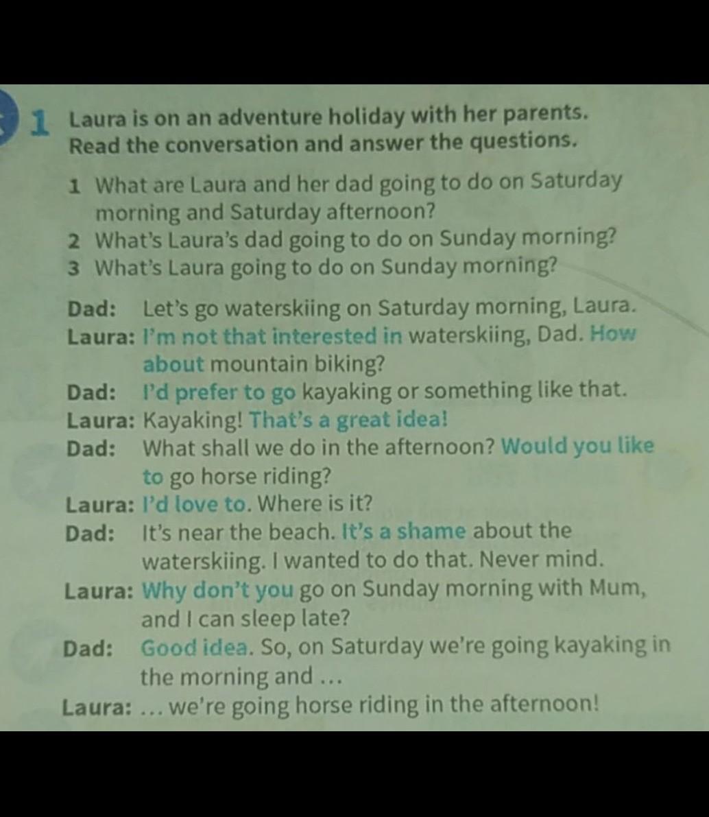 Laura is on an adventure holiday with her parents. Read the conversation and answer the questions. ДОПОМОЖІТЬ БУДЬ ЛАСКА