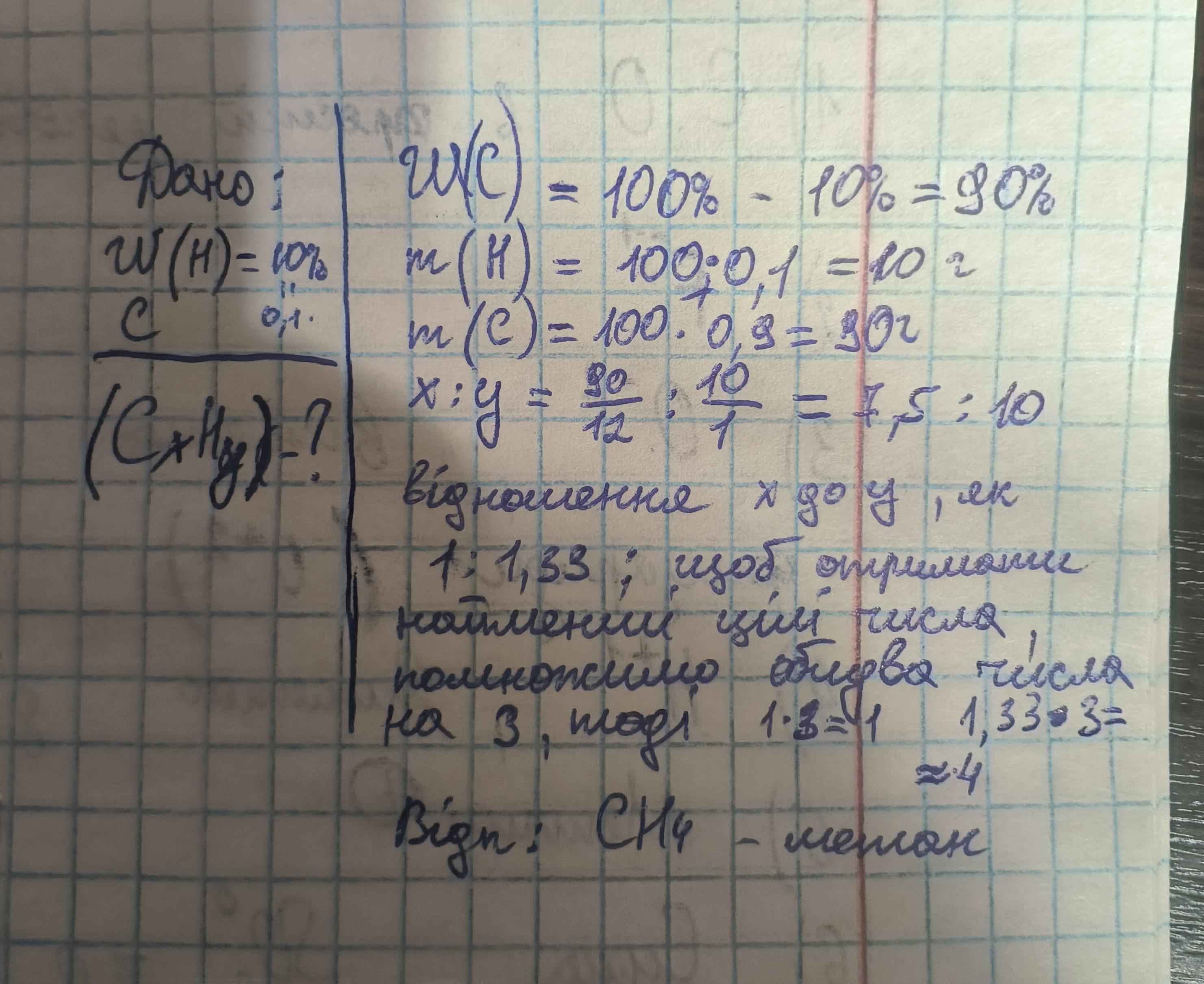 До складу органічної речовини входять атоми Гідрогену, масова частка яких становить 10 %, а решта — Карбон. Установіть найпростішу формулу речовини, вказавши у відповіді число атомів Карбону.