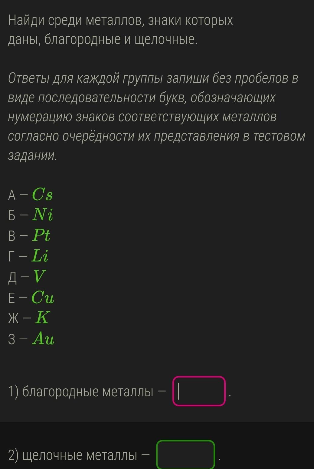 Найди среди металлов, знаки которых даны, благородные и щелочные. Ответы для каждой группы запиши без пробелов в виде последовательности букв, обозначающих нумерацию знаков соответствующих металлов согласно очерёдности их представления в тестовом задании. A-Cs Б-Ni B - Pt Г- Li Д-V E-Cu Ж-К 3 - Au 1) благородные металлы - 2) щелсочные металлы