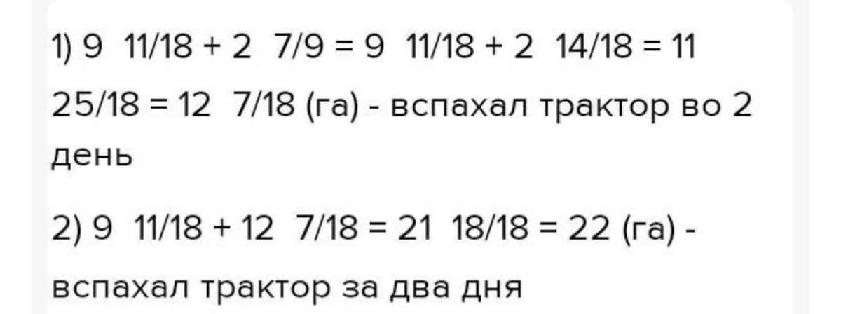 первый день трактор вспахал 9 целых 11/18 дых га земли во второй день на два целых 7/9 больше сколько гектаров земли вспахал тракторист за два дня?