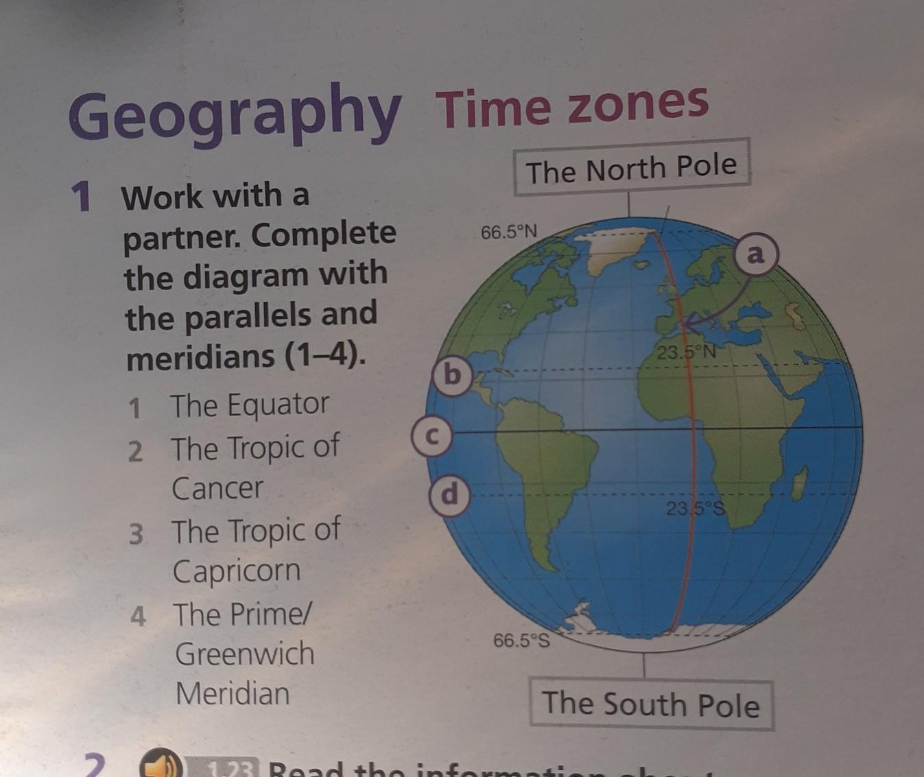 Geography Time zones The North Pole 1 Work with a partner. Complete the diagram with the parallels and meridians (1-4). 1 2 The Equator The Tropic of Cancer 3 The Tropic of Capricorn 4 The Prime/ Greenwich Meridian C b 66.5°N 66.5°S 23.5°N 23.5°S a The South Pole