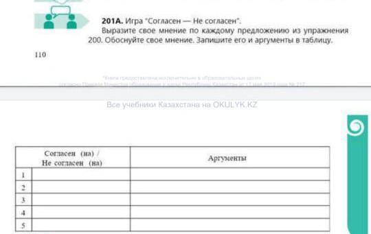 201А. Игра "Согласен - Не согласен". Выразите свое мнение по каждому предложению из упражнения 200. Обоснуйте свое мнение. Запишите его и аргументы в таблицу. Согласен (на) Не согласен (на) Все учебники Казахстана на OKULYK.KZ Аргументы
