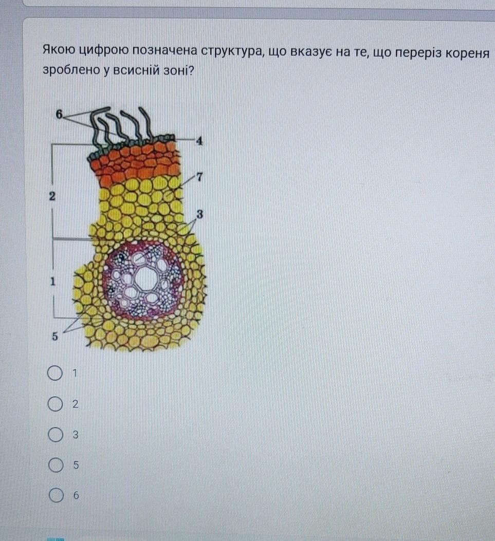 Якою цифрою позначена структура, що вказує на те, що перерiз кореня 1 зроблено у всиснiй зонi?