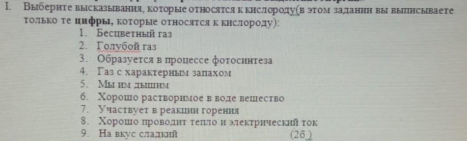 1. Выберите высказывания, которые относятся к кислороду(в этом задании вы выписываете только те цифры, которые относятся к кислороду): II T₂ 1. Бесцветный газ 2. Голубой газ 3. Образуется в процессе фотосинтеза Газ с характерным запахом 4. 5. Мы им дышим 6. Хорошо растворимое в воде вещество Участвует в реакции горения 7. 8. Хорошо проводит тепло и электрический ток 9. На вкус сладкий (26)