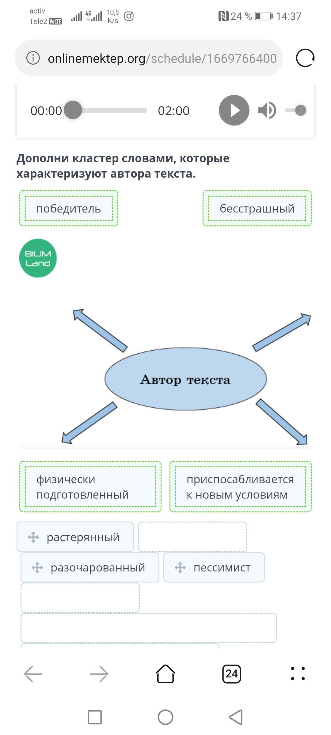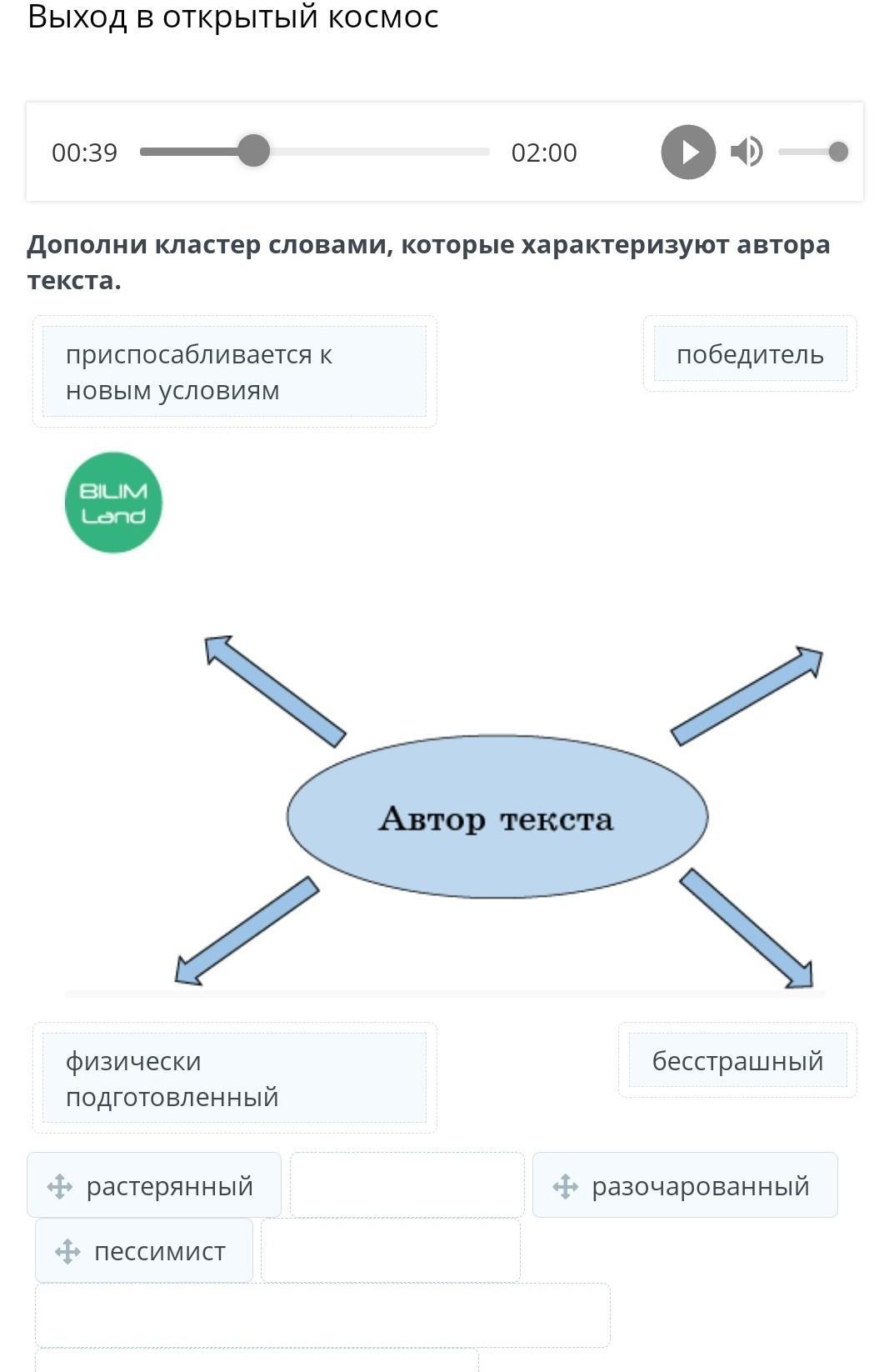 Выход в открытый космос 00:39 приспосабливается к НОВЫМ Условиям Дополни кластер словами, которые характеризуют автора текста.