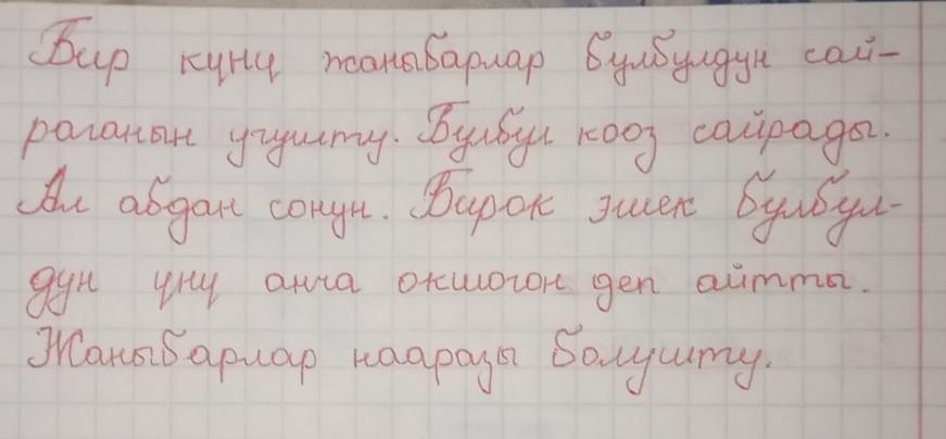 35. Сүйлөмдөрдү толуктап жазып, бири-биринерге окуп бергиле. Бир күнү жаныбарлар булбулдун сайраганын сайраганын ... . Эшекти кылышты. Булбул ... сайрады. Ал абдан сонун Бирок эшек булбулдун үнү ... окшогон жок деп айтты. Жаныбарлар болушту. нааразы ... • ...