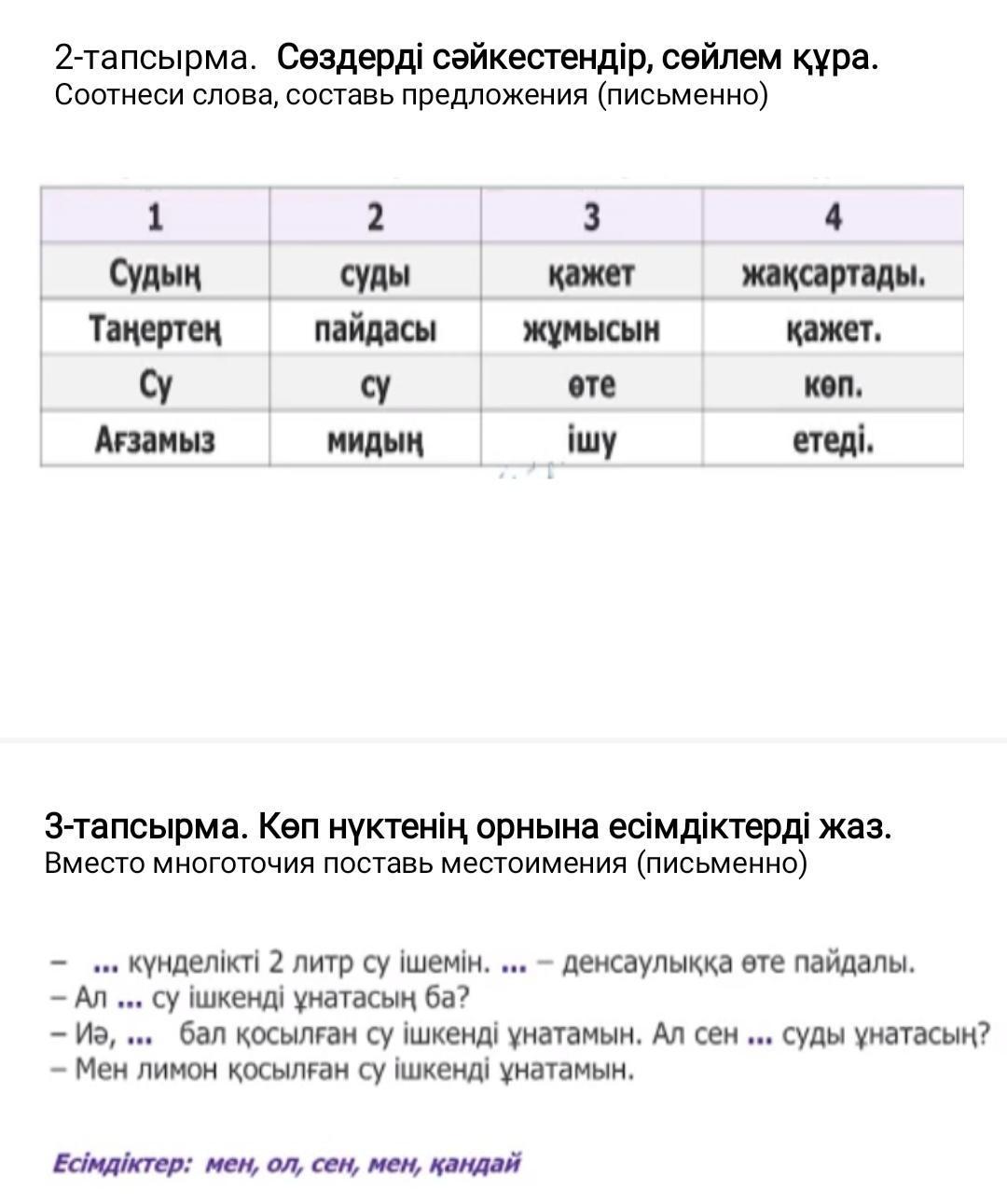 -Мен күнделікті 2 литр су ішемін. Ол денсаулыққа өте пайдалы.