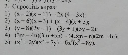 2. Спростіть вираз: 1) (x-2)(x - 11) – 2x (4 - 3x): 2) (x+6)(x-3) - (x – 4)(x - SH 3) (y - 8) (2y - 1)-(3x - 1)(5v-¹2); 4) (3m - 4n)(3m - 5n) – (4.5m – n)(2m +4n); 5) (x² + 2y)(x² + 7y) - 6x*(x² – 8y).